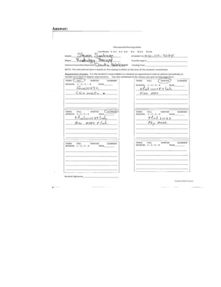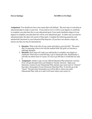 Steven Santiago is enrolled in SLS1001, which meets on Mondays from 5-6:15pm. The assignment asks students to develop an educational plan to achieve their defined career goals. Students must identify whether an AA, AAS, certificate or bachelor's degree is needed. They then answer three questions - their career title and job goal, the realistic time to complete their degree part-time or full-time, and attach a screenshot of their official education plan from their advisor. Santiago's career goal is to become a radiology therapist in the medical field.
