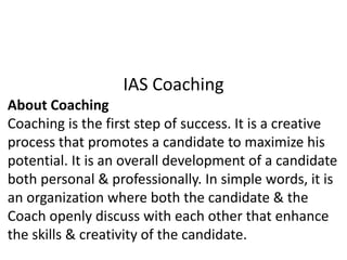Career coaching involves guiding individuals in choosing careers and developing professional skills over their lifespan. A career coach helps clients identify their strengths and interests to accelerate career success. Coaching for the Indian Administrative Service (IAS) is especially important as it is a highly responsible and challenging position that requires strong administrative abilities. An effective IAS coach understands the government structure and selects teaching methods to help students learn policies, procedures, and leadership skills for qualifying and performing well in the civil service.