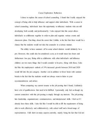 The author explored the career of school counseling and found they enjoyed influencing and supporting students. They also liked collaborating with others on events and lesson plans. However, one concern was students not taking counselors seriously.