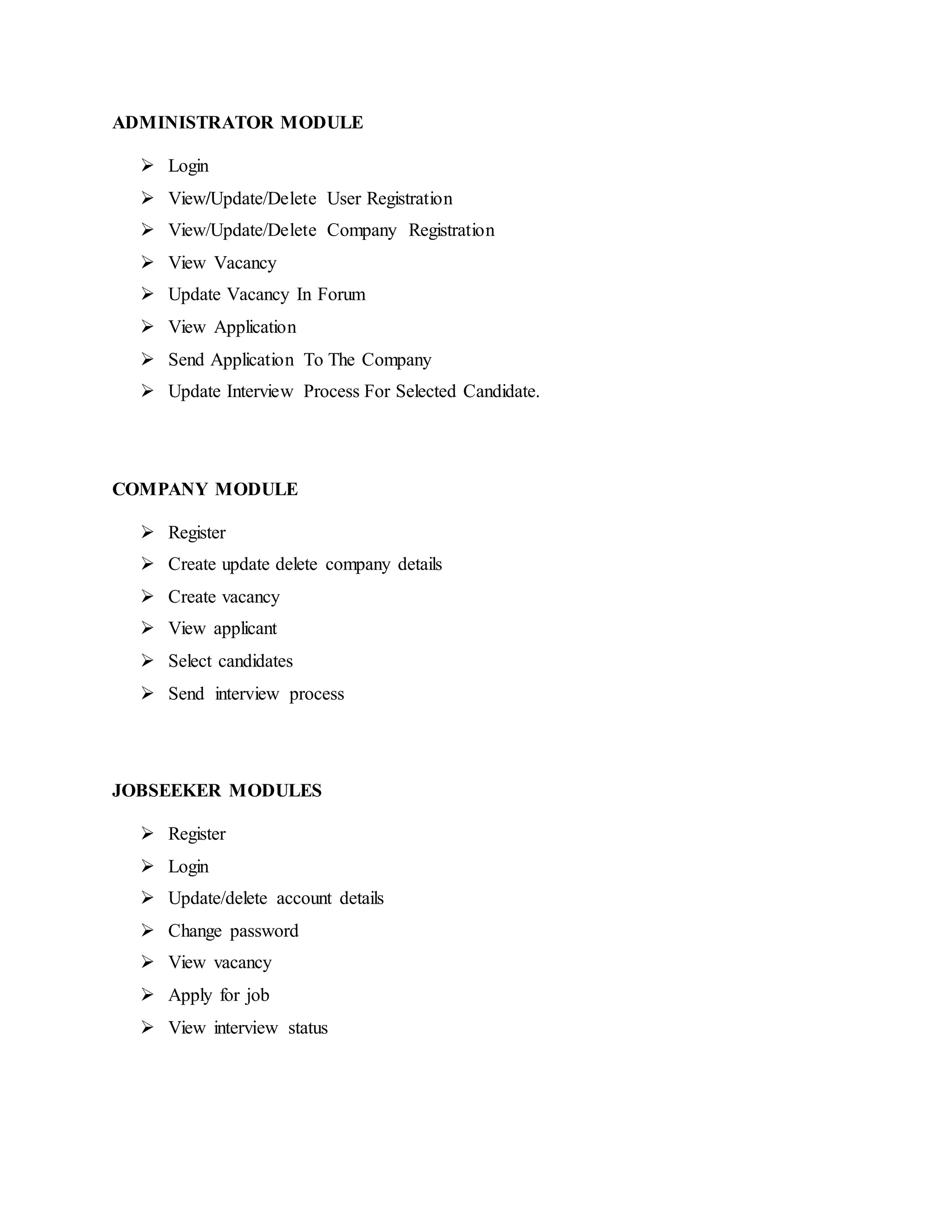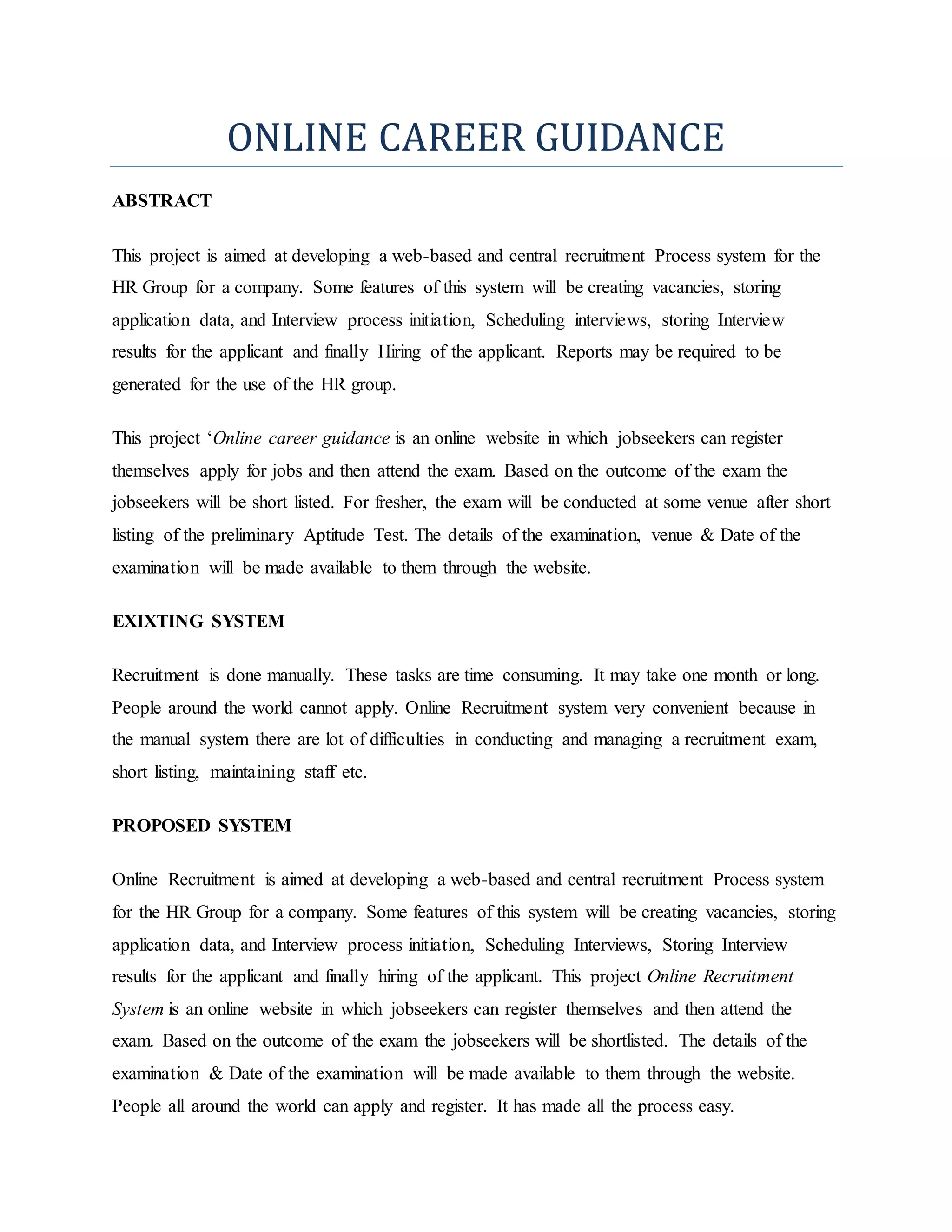 This document describes an online career guidance system that allows job seekers to register, apply for jobs, take online exams, and check their interview status. The proposed system aims to develop a web-based central recruitment system for a company's HR group. It will automate tasks like creating job postings, storing applicant information, scheduling interviews, and hiring. This will make the recruitment process more efficient compared to a manual system. The system will have modules for administrators, companies, and job seekers.