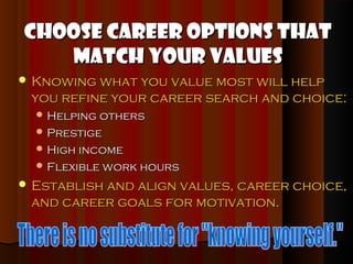 Rule 1) Choose a career you really enjoy. Rule 2) Do thorough research. Rule 3) Make your career meaningful to you. It also discusses factors to consider like interests, skills, values and goals. The document emphasizes exploring options, getting advice, following your passion, and daring to try something new.