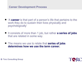 This document discusses the career planning and development process, emphasizing that a career encompasses a series of related jobs and the importance of self-awareness and effective management. It outlines the benefits of taking charge of one’s career, including improved job satisfaction and professional development, while stressing the need for strategic planning and networking amidst changing organizational landscapes. The text also highlights the motivational role of setting goals in career progression and provides a sample career plan.