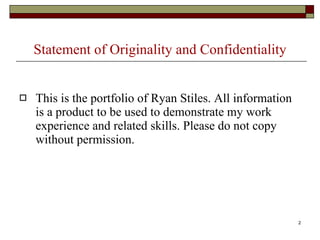 The document outlines Ryan Stiles' career portfolio which details his educational and work experience goals of becoming a registered pharmacy technician. It includes sections on his resume, academic studies in the pharmacy technician program, and samples from his high school diploma and other certificates. The introduction expresses his determination to succeed in the pharmacy field through hard work and a calm demeanor.