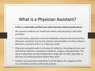 Physician assistants are nationally certified and state-licensed medical professionals who examine, diagnose, and treat patients under the supervision of physicians. They conduct physical exams, order tests, diagnose illnesses, set bones, prescribe medication, and assist in surgery. To become a PA requires a bachelor's degree, completion of a master's degree from an accredited PA program, passing a national certifying exam, and state licensure. Employment of PAs is projected to grow 30% by 2024 due to an increasing demand for primary care providers.
