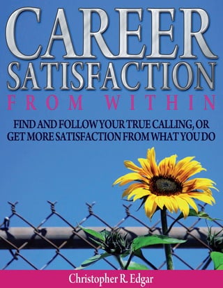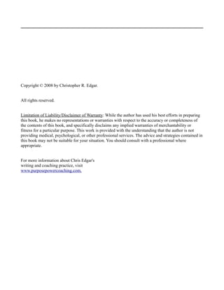 This document provides a summary and disclaimer for a book on finding purpose and passion in one's career. It summarizes that the author uses his experience coaching clients to address when people feel a lack of fulfillment in their work due to basing their self-worth too heavily on their career success or demands. The book presents exercises to help readers develop a sense of wholeness independent of work outcomes. It disclaims any guarantee of advice or strategies working for all situations, and directs readers to consult professionals as needed.