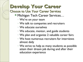 Career Services provides resources to help students develop their careers, including educational seminars, resume and interview preparation, career fairs, and recruiting events. They meet with companies and recruiters, and strive to help students attain jobs during and after college. The presentation emphasizes using one's resume to provide evidence of skills employers seek, such as leadership, communication, and technical abilities. It also covers interview preparation, career fairs, and online tools like NACElink that connect students with employer opportunities.