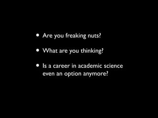 This document provides advice on pursuing an academic career in science. It begins with the author questioning whether such a career is still feasible given low success rates for fellowship and grant applications. The author then outlines their own academic career path from 1978-2005. They note that their own history is not relevant to current challenges. The document also lists former students and fellows, noting many have pursued careers outside of academia. It provides tips for improving chances of success, such as networking and customizing applications. Finally, it discusses traits of highly creative people and includes additional resource links.