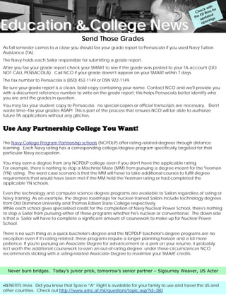 The document provides a summary of Navy career news from November 1-30 2009. It discusses advancement examinations, the elimination of enlisted service records being replaced with electronic records, simplifying the transition between active duty and reserve status, and education/college news including submitting grades for tuition assistance and using any Navy college partnership program.