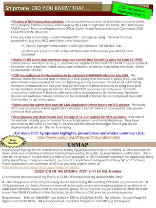 The document provides information from the Navy Counselors Symposium including highlights on restoration of ratings and the Post 9/11 GI Bill. It discusses benefits of the Post 9/11 GI Bill for active duty members and veterans/dependents including tuition assistance, housing allowance, and book stipends. The bill now allows service members to transfer benefits to dependents if they commit to 4 more years of service after 6 years of active duty. The document encourages sailors to consider teaching careers through the Troops to Teachers program and provides details on an informational session about the program. It also provides updates on extensions for sailors on PTS and sailors' new ability to submit their own CMS applications when in their PCS window.