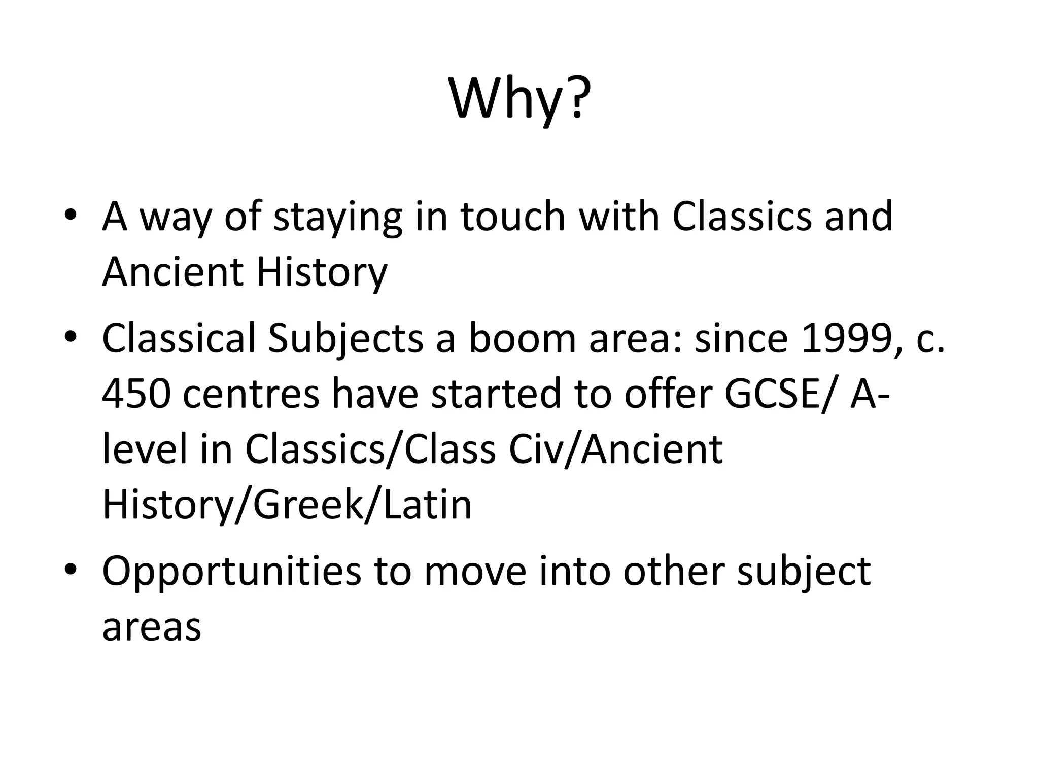 This document provides information about careers in teaching classics and ancient history, as well as an MA in Classics and Ancient History. It discusses reasons to pursue teaching or an MA, possible routes to teaching such as PGCE programs, and an overview of the structure and content of an MA program. Key details include requirements for classics teaching such as A-level Latin proficiency, course structures involving research training, taught courses and a dissertation, and costs and funding options for an MA degree.