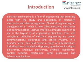 Electrical engineering deals with electricity, electronics, and electromagnetism. It covers areas like power, communications, electronics, and control systems. To become an electrical engineer, one must study science at intermediate level and then take an entrance exam to study BE/BTech in electrical engineering for 4 years. Electrical engineers have good job prospects in generating and distributing electricity to industries and homes. The average salary of an electrical engineer in India is Rs. 347,459 per year. Some top institutes for studying electrical engineering include Bharath University, Vignan University, KIIT University, and Galgotias University.