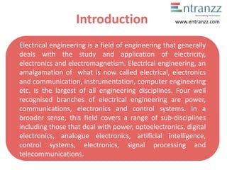 Electrical engineering deals with electricity, electronics, and electromagnetism. It is one of the largest engineering disciplines and includes fields like power, communications, electronics, and control systems. To become an electrical engineer, one must study science at intermediate level and then obtain a 4-year BE/BTech degree in electrical engineering after qualifying entrance exams like IIT-JEE. There are also job opportunities for electrical engineers in power generation, distribution, transmission and a wide variety of industries due to electricity's importance. The average salary for an electrical engineer in India is Rs. 347,459 per year.