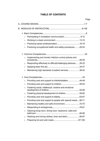 This document outlines the competency-based curriculum for the Caregiving NC II qualification in the Philippines. It consists of 3 parts: basic competencies, common competencies, and core competencies. The basic competencies cover workplace communication, teamwork, professionalism, and occupational health and safety. The common competencies address infection control, difficult behavior response, first aid, and patient services. Finally, the core competencies focus on providing care to different groups like infants, children, elderly and those with special needs. The curriculum aims to develop the necessary knowledge, skills and attitudes to work as a caregiver according to industry standards.