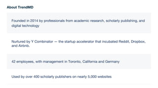 TrendMD, founded in 2014, enhances content discovery for researchers and publishers by providing personalized recommendations based on user behavior across over 5,000 scholarly websites. The platform uses collaborative filtering and has been shown to significantly increase article citations and reader engagement, outperforming traditional sources. Case studies demonstrate its effectiveness in driving author submissions and healthcare professional signups through targeted campaigns and referrals.