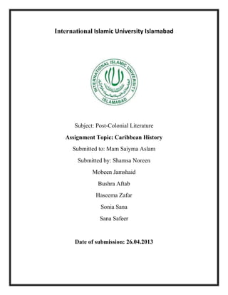 This document provides an overview of the history and literature of several Caribbean islands including Jamaica, Dominica, Barbados, Trinidad, Saint Lucia, and the wider Caribbean region. It discusses the indigenous peoples, European colonization, the slave trade and its abolition, independence movements, and important post-colonial writers from each island such as George Lamming of Barbados, Merle Hodge of Trinidad, and Roderick Walcott of Saint Lucia. The document examines how these writers addressed themes of identity, racism, and the Caribbean experience under colonial rule in their works.