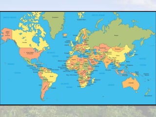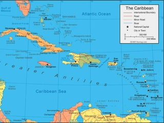 The document discusses the geography, culture, and diversity of the Caribbean region. It describes the islands, volcanoes, mountains, rainforests, and coral reefs that make up the Caribbean landscape. It also notes that the Caribbean is a melting pot, with tropical fruits and spices in the cuisine, percussion-driven music, and six official languages including Creole and Papiamento reflecting the region's cultural influences from indigenous, European, and African peoples.