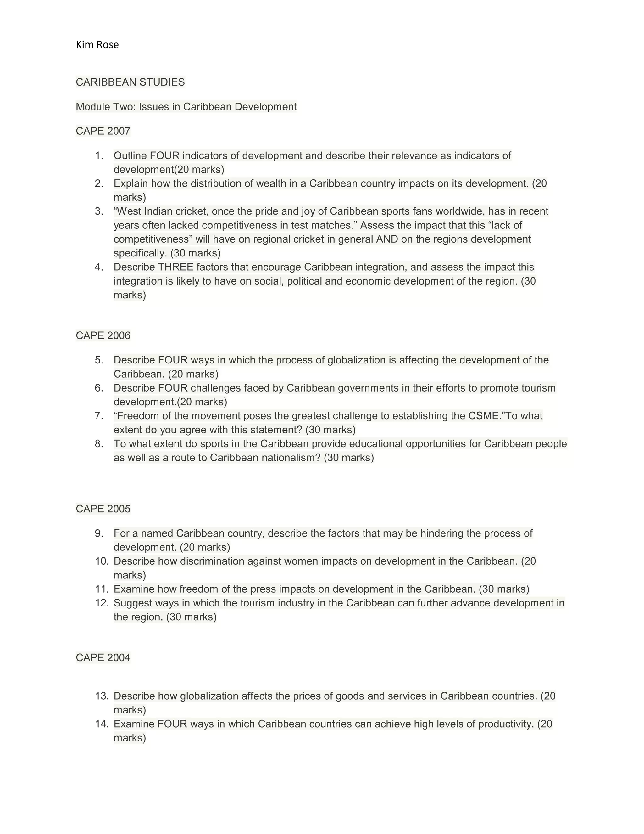 This document outlines 20 essay questions from CAPE (Caribbean Advanced Proficiency Examinations) exams from 2003-2007 related to issues in Caribbean development. The questions address a range of topics including indicators of development, the impact of wealth distribution, challenges facing Caribbean cricket and governments, factors influencing Caribbean integration, the effects of globalization, and ways various sectors like tourism, media, and culture have impacted regional development.