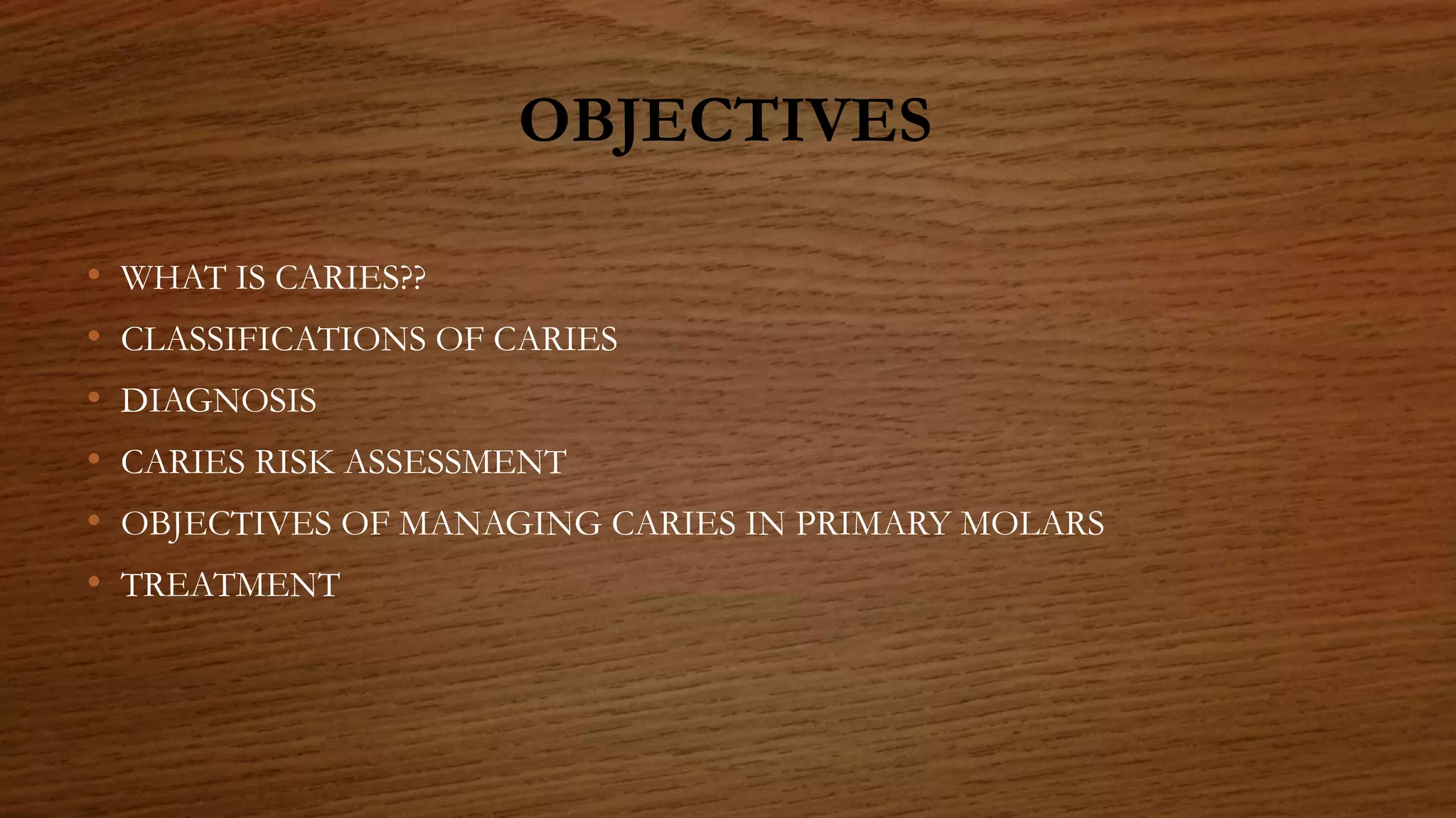 This document discusses strategies for managing caries in primary molars. It begins by defining caries and describing classifications. Diagnosis involves history, clinical examination including visual, palpation, percussion and mobility tests, and radiographs. Risk assessment considers plaque control, diet, fluoride use, saliva analysis and medical conditions. Objectives of managing caries are to prevent pain, local infection, injury to permanent teeth, and maintain mastication and aesthetics. Treatment options include prevention, restoration of enamel-dentine caries, and pulp therapy such as pulpotomy or pulpectomy. Preventive strategies emphasize plaque control, diet, fluoride and sealants. Restorative options and criteria for stainless steel crowns and space