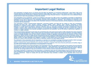 This document summarizes Carillion's proposed acquisition of Eaga. The acquisition is expected to create a scalable platform to build the UK's largest independent energy services provider. It will enhance Carillion's position in the growing low carbon market and increase its capabilities to provide integrated solutions. The transaction is expected to be immediately earnings enhancing even before synergies. Carillion has secured new borrowing facilities that will comfortably fund the cash portion of the deal and expected integration costs, while maintaining a robust capital structure for the combined company.
