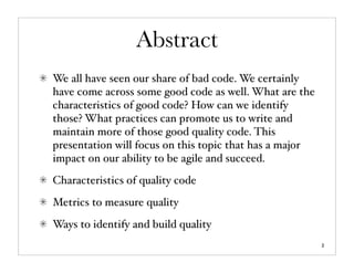 The presentation by Venkat Subramaniam emphasizes the importance of code quality in achieving agility and success in software development. It discusses characteristics of good code, the costs associated with defects, and ways to promote high-quality coding practices through individual and team efforts. Strategies include peer reviews, maintaining simplicity, addressing technical debt, and fostering a culture of continuous improvement to enhance software reliability and maintainability.