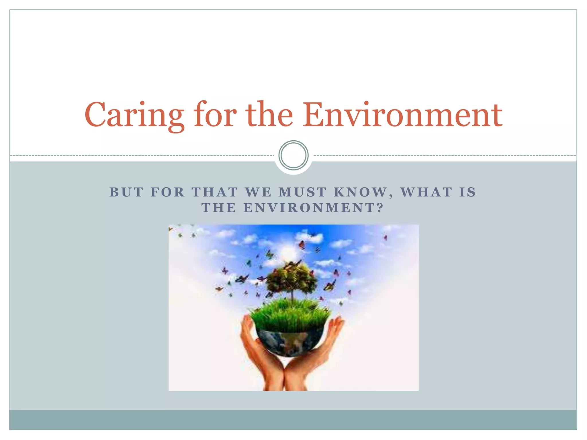 The environment consists of all living and non-living things that naturally interact in specific areas, most commonly referring to Earth or parts of Earth. It involves the interconnection between all living things, climate, and natural resources that impact human life and the economy. The document provides tips for caring for the environment such as separating garbage, using reusable products, turning off unnecessary lights, eating organic food, avoiding leaving appliances plugged in, closing taps fully, using thermostats efficiently, and taking public transportation.