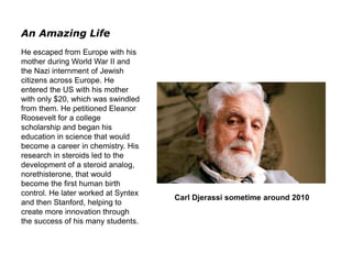Carl Djerassi, a chemist who escaped Nazi Europe, is best known for developing the first human birth control pill, norethisterone, which had a significant societal impact. His personal life was marked by tragedy, including the suicide of his daughter Pamela, which inspired him to create the Djerassi Resident Artists Program to support living artists. Throughout his life, he balanced his scientific contributions with his dedication to the arts, leaving a lasting legacy in both fields.