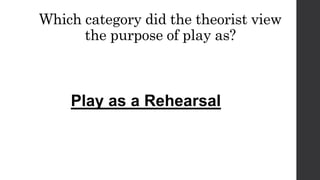 Carl Rogers believed that people behave according to how they perceive their situation, and that their basic motive is to achieve their highest potential. Each person develops uniquely based on their personality and experiences. Self-actualization occurs when one's ideal self is consistent with their behavior. Rogers identified five characteristics of a fully functioning person: openness to experience, existential living, trusting feelings, creativity, and a fulfilled life. He also viewed play as allowing children to rehearse and practice new skills before applying them in real situations.