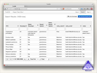 The document discusses the tree of life and efforts to construct a complete digital tree of life. It notes that an ideal tree of life would be complete, continuously updated, and digitally available. Several challenges are outlined, including how to handle incongruences between trees and how to synthesize data across the entire tree. Efforts are underway to synthesize published phylogenetic data and make tree of life resources and data openly available online. Remaining challenges include improving taxonomic coverage, incorporating time information, and enabling community feedback and annotation. The goal is to move beyond a single tree and provide tools to enable custom synthesis and integration with other resources and data.