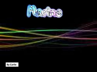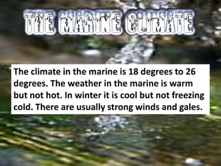 The climate in the marine environment is typically warm, with temperatures between 18 to 26 degrees Celsius in the winter and cooler winds year-round. The oceans cover 70% of the Earth's surface, with the Pacific Ocean alone encompassing 30%. Marine life inhabits all oceans around the world and includes animals like fish, whales, seals, and birds, as well as plants such as seaweed, kelp, algae, and coral.