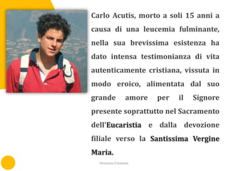 Carlo Acutis, morto a 15 anni a causa di una leucemia, ha vissuto una vita esemplare profondamente radicata nella fede cristiana, con particolare devozione per l'Eucaristia e la Vergine Maria. Oltre a essere un talentuoso amante della tecnologia e del volontariato, ha cercato la santità e ha offerto le sue sofferenze per la Chiesa. La sua vita e i suoi insegnamenti continuano a ispirare molti, mettendo in evidenza l'importanza della spiritualità oltre le preoccupazioni materiali.