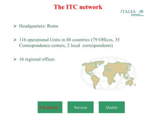 The Italian Trade Commission (ITC) promotes trade between Italy and other countries by supporting small and medium Italian companies seeking to expand internationally. It has over 116 operational units in 88 countries, including 79 offices and 35 correspondence centers. The ITC carries out promotional initiatives in 70 countries each year for 90 different trade sectors, involving thousands of Italian and foreign companies. It also trains young professionals and entrepreneurs to help them internationalize.