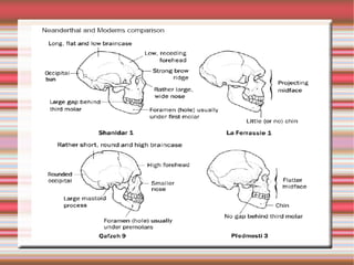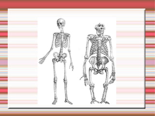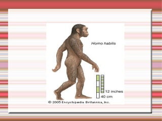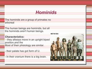 Hominids first appeared as the Earth cooled and became more arid. The earliest known hominid is Ardipithecus ramidus. Key characteristics of hominids include bipedal locomotion, thick dental enamel, and larger brains and cranium sizes over time. Early hominid species include Australopithecus anamensis, A. afarensis, and Paranthropus. Homo habilis were the first remains of the genus Homo found, with bigger brains and less body hair. Later Homo species such as H. erectus used fire and had more elongated craniums, while H. antecessor were hunters. Neanderthals and Homo s