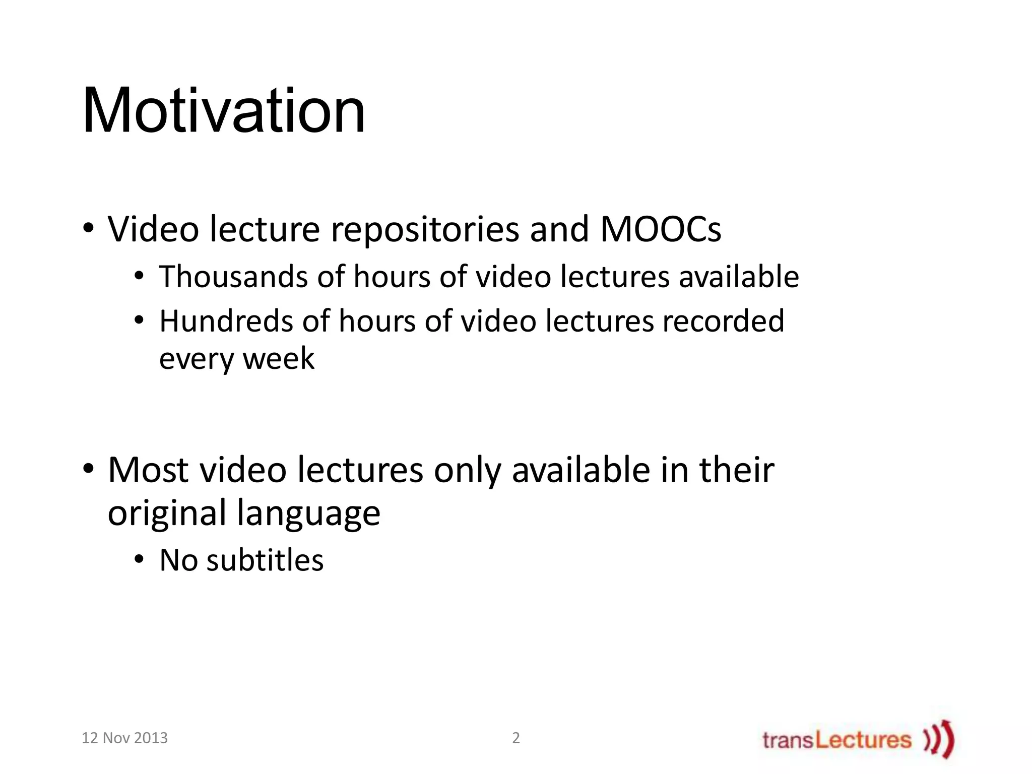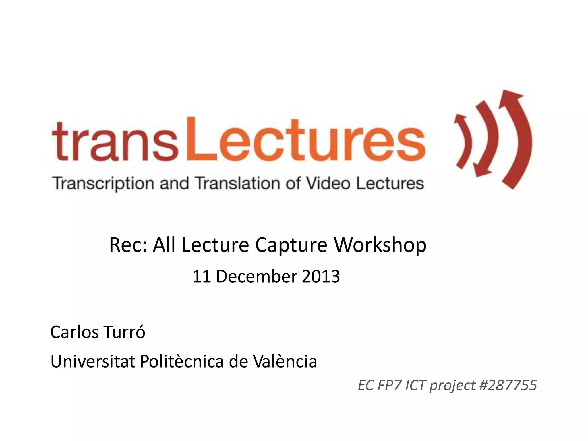 The document presents the TransLectures project, which aims to improve accessibility to video lectures by developing automatic speech recognition (ASR) and machine translation (MT) systems for transcriptions and translations. It discusses the project's goals, partnerships, and implementation strategies, as well as case studies involving videolectures.net and polimedia. The initiative also outlines plans for future enhancements and collaborations in the field of educational resources.