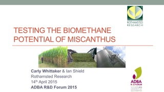 This document summarizes research testing the biomethane potential of Miscanthus harvested green and stored as silage. The study compares Miscanthus to maize, the control. Preliminary results found that Miscanthus can be stored as silage, especially with additive application, with negligible dry matter losses. Biomethane potential tests are ongoing. The research aims to determine if early harvested and ensiled Miscanthus is a viable substitute for maize in anaerobic digestion plants.
