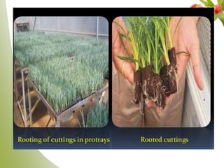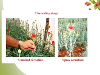 Carnation, the most significant cut flower globally, has a basic chromosome number of 15 and originates from southern France, with varying cultivars like standard and spray types. Grown under specific climate conditions and requiring precise nutrient and pest management, carnations feature a diverse range of flower forms and colors but can face challenges such as calyx splitting and various pests and diseases. Harvesting occurs in multiple stages, with yields varying between standard and spray varieties, highlighting their importance in floriculture.