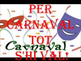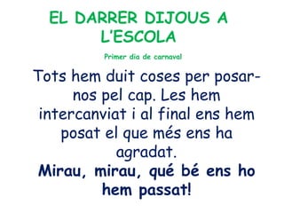 Carnaval dijous 1. 2. EL DARRER DIJOUS A L’ESCOLA Tots hem duit coses per posar-nos pel cap. Les hem intercanviat i al final ens hem posat el que més ens ha agradat. Mirau, mirau, qué bé ens ho hem passat! Primer dia de carnaval 3. 4. 5. 6. 7. 8. 9. 10. 11. 12. 13. 14. 15. 16. 17. 18. 19. 20. 21. 22.