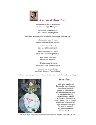 Il documento propone una raccolta di poesie e filastrocche sul tema del Carnevale, con riferimenti a diverse maschere tradizionali come Arlecchino, Pulcinella e Colombina. Ogni testo celebra l'allegria e i travestimenti tipici di questa festività, illustrando scenari vivaci e coinvolgenti. Inoltre, il documento include anche suggerimenti di lettura per bambini così da offrire spunti creativi e ludici legati al Carnevale.