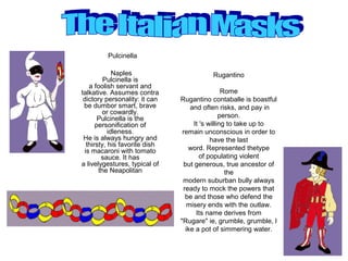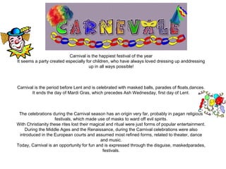 The document discusses Carnival traditions in Italy. It is celebrated with masked balls, parades, dances, and marks the period before Lent. The celebrations originated from pagan festivals using masks to ward off evil spirits. During the Middle Ages and Renaissance, Carnival celebrations were introduced in European courts. Today, Carnival is an opportunity for fun expressed through costumes, parades, and festivals. The document also provides descriptions of common Carnival character masks from different Italian regions such as Pulcinella from Naples and Pantalone from Venice.