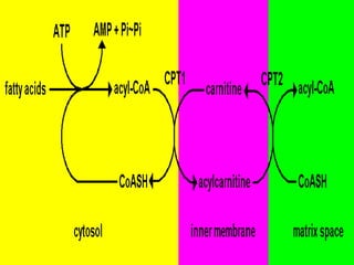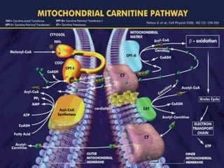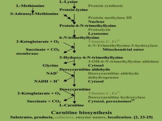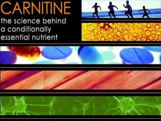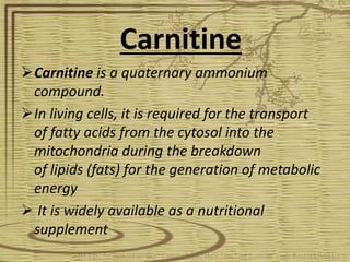 Carnitine is a quaternary ammonium compound that transports fatty acids into mitochondria for energy production. It is biosynthesized from the amino acids lysine and methionine in the liver and kidneys. Carnitine carries long-chain fatty acids into mitochondria, where they undergo beta-oxidation to produce acetyl-CoA for the citric acid cycle. Carnitine supplements are used to treat heart conditions, kidney disease, male infertility, weight loss, valproic acid poisoning, asthma, cancer chemotherapy side effects, and hyperthyroidism.