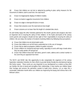 This document provides safety guidelines for children participating in September celebrations in Belize. It recommends that carnival groups ensure written parental consent for children, prepare children physically, provide food and water, implement safety measures to prevent lost or abducted children, and establish dress codes. It also advises parents to ensure children do not attend adult events, are not left unattended, and know contact details in case of separation. The goal is for children to enjoy celebrating their culture and heritage in an empowering and age-appropriate manner.