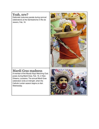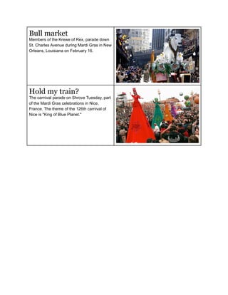 The document provides descriptions of Mardi Gras and carnival celebrations taking place in various locations around the world in mid-February, including in New Orleans, Nice, Rio de Janeiro, Ivrea, Mohacs, and Venice. The celebrations involve parades with elaborate costumes and masks, orange battles commemorating a local revolt, masked men parading on boats, a young drum queen crying at her position in a samba school parade, and revelers in carnival costumes and masks in St. Mark's Square in Venice.