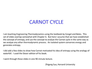 The document discusses the Carnot cycle. It begins by establishing the concept of entropy and analyzing the Carnot cycle as any other thermodynamic process. The Carnot cycle consists of isothermal processes at two temperatures TH and TL and two isentropic processes. All reversible engines running in a cycle between reservoirs at two fixed temperatures TH and TL have the same maximum thermal efficiency known as the Carnot efficiency. Real engines are irreversible and have a thermal efficiency below the Carnot limit.