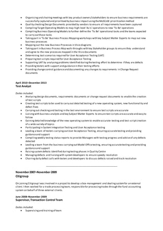 Carol Rodger has over 20 years of experience in business analysis, testing, and operations roles. She currently works as a Business Analyst at People's Postcode Lottery using Agile methodology. Previously she was a Business Analyst and Test Analyst at Franklin Templeton Investments using Waterfall methodology and held roles at Citigroup, FNZ Wrap UK Ltd, and Mellon European Fund Services.