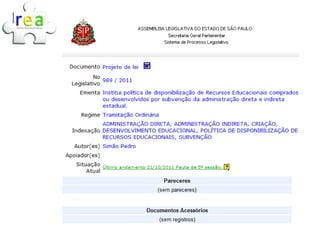 The document discusses the challenges and perspectives of Open Educational Resources (OER) in Brazil, highlighting the potential for innovation through open systems and networks, while also acknowledging the legal, economic, and social barriers faced. It emphasizes the need for institutional and governmental support to develop a framework for OER that prioritizes public access and quality in education. Additionally, the document encourages collaboration among educators and advocates for the inclusion of OER in Brazil's National Education Plan to enhance educational equity and learning opportunities.