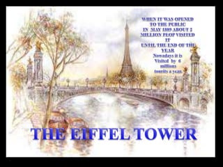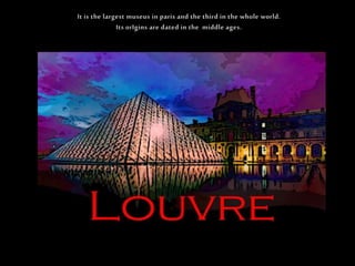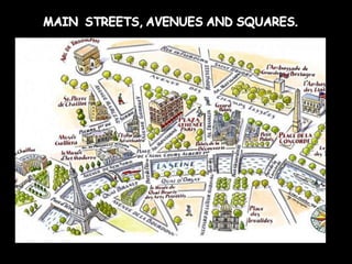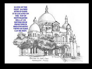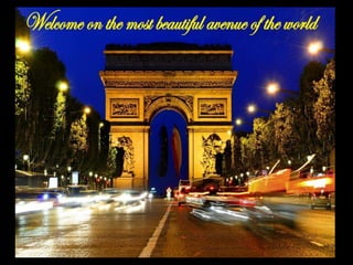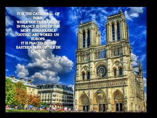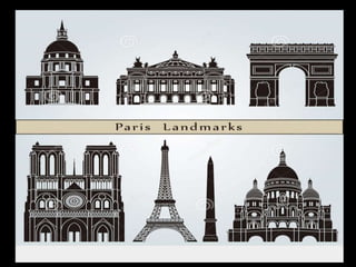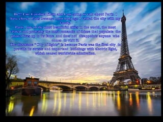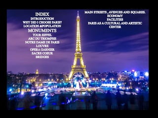 Paris is one of the most popular tourist destinations in the world due to its rich history, architecture and culture. The document discusses several of Paris's most famous landmarks and neighborhoods, including the Eiffel Tower, Notre Dame Cathedral, Louvre Museum, Champs-Elysees, Arc de Triomphe and shopping districts like Avenue Montaigne. It also highlights Paris's position in Europe and its reputation as a center of business, art and cuisine.