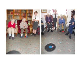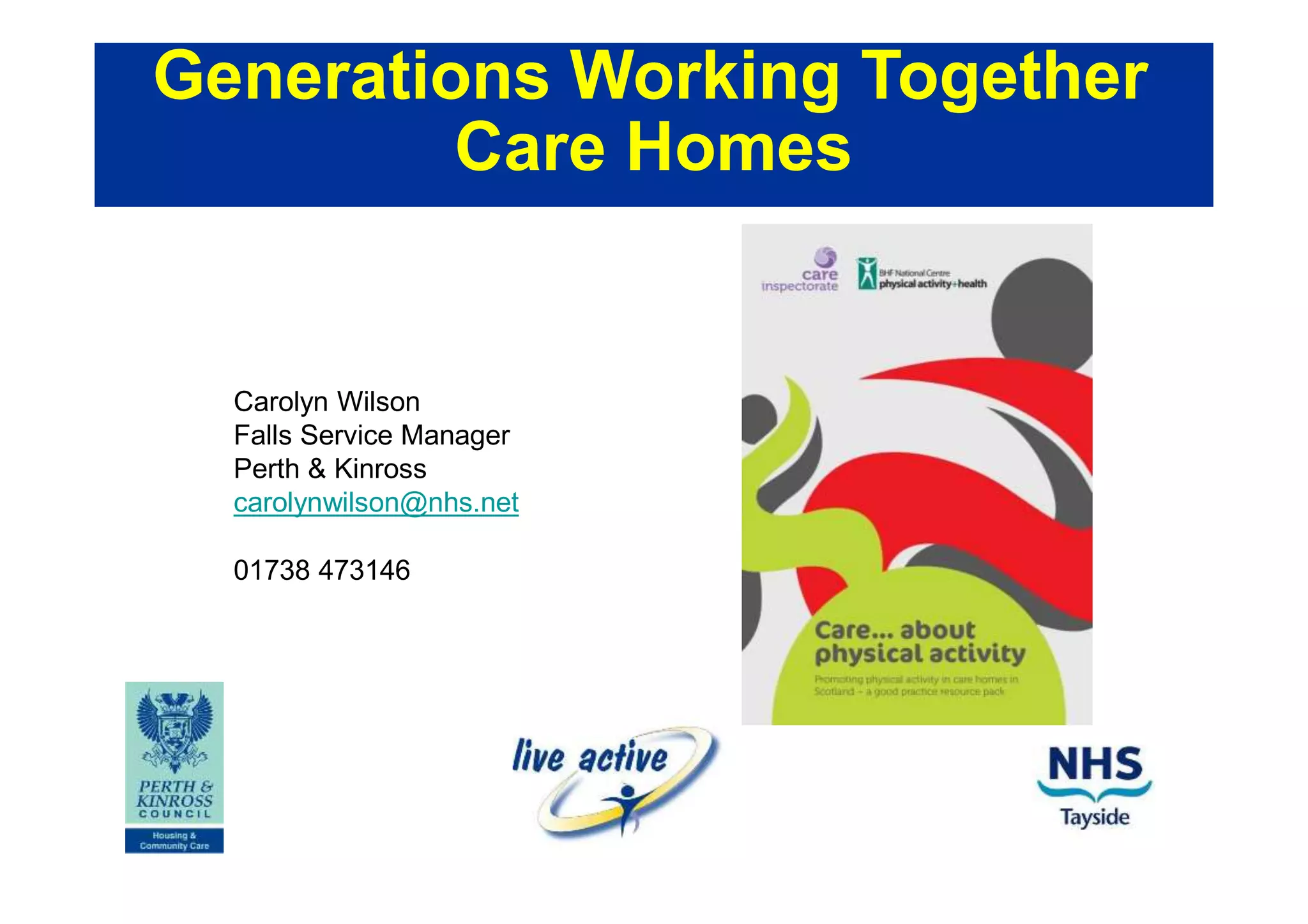 This document describes intergenerational programs between care homes and local schools and communities in Perth and Kinross, Scotland. It outlines various activities organized by the Generations Working Together group including an annual Go4Gold Care Home Challenge, strength and balance exercise programs led by fitness students, and walking programs. It provides details on two pilot projects with Living Streets to improve walking paths and engage older adults, care home staff, and local stakeholders. Feedback indicates residents and staff enjoyed the intergenerational activities and residents experienced improvements in mobility and balance from the exercise programs.