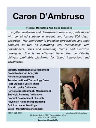 Caron D'Ambruso is an experienced medical marketing and sales executive with over 30 years of experience leading marketing and sales initiatives for major medical device companies. She has a track record of successfully launching new products, growing businesses, and gaining market share. Her expertise includes branding, relationship building, strategic planning, product development, and sales management.