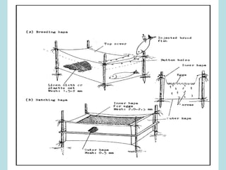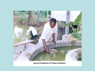 This document summarizes information about Indian major carps and their reproductive biology. It discusses that the three major carps - Catla, Rohu and Mrigal - attain sexual maturity in their second year. Males mature earlier than females. Spawning occurs during the monsoon season in river systems. Carp eggs consist of a yolk surrounded by membranes and a micropyle. Hatching and larval development are also described. Methods for seed collection, induced breeding and hatchery operations are provided.