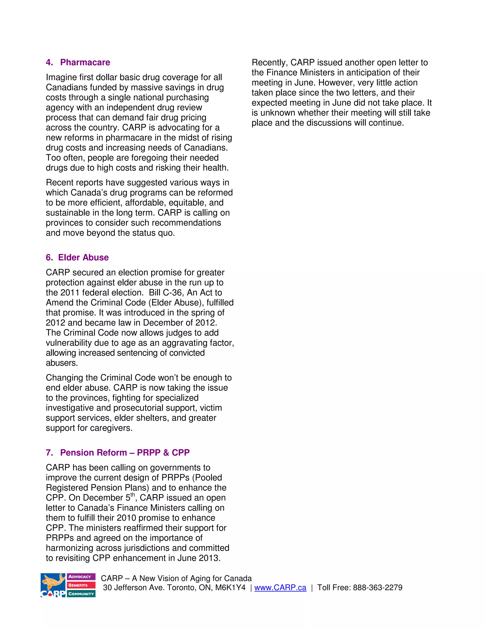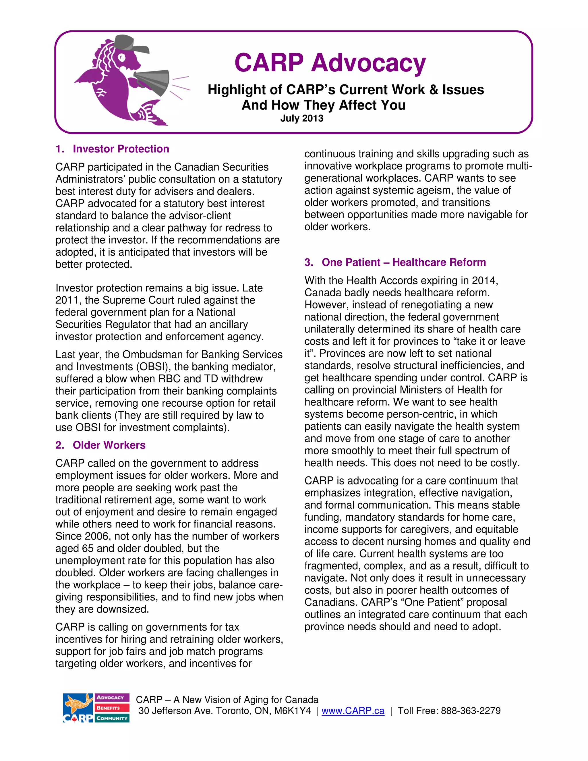 CARP advocates for issues affecting older Canadians, including investor protection, employment for older workers, healthcare reform, pharmacare, elder abuse, and pension reform. For investor protection, CARP advocates for a statutory best interest standard for financial advisors. Regarding older workers, CARP calls for initiatives to address ageism and help older workers find and keep jobs. For healthcare, CARP's "One Patient" proposal outlines an integrated care continuum to improve patient navigation of the system. CARP also advocates for national pharmacare and reforms to reduce drug costs.