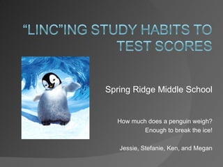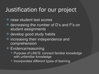 The document summarizes a study conducted by students at Spring Ridge Middle School to determine if using the LINCS strategy improves vocabulary retention and understanding. The study involved two classes, with one class using LINCS one week and the other class the next week. Results from pre-and post-tests and student surveys showed no significant differences in vocabulary scores between the classes and mixed reactions to LINCS. Observations found students were initially confused by LINCS and did not effectively use the strategy. The researchers concluded that LINCS may be better suited to high school students if more time is spent learning and consistently using the strategy.